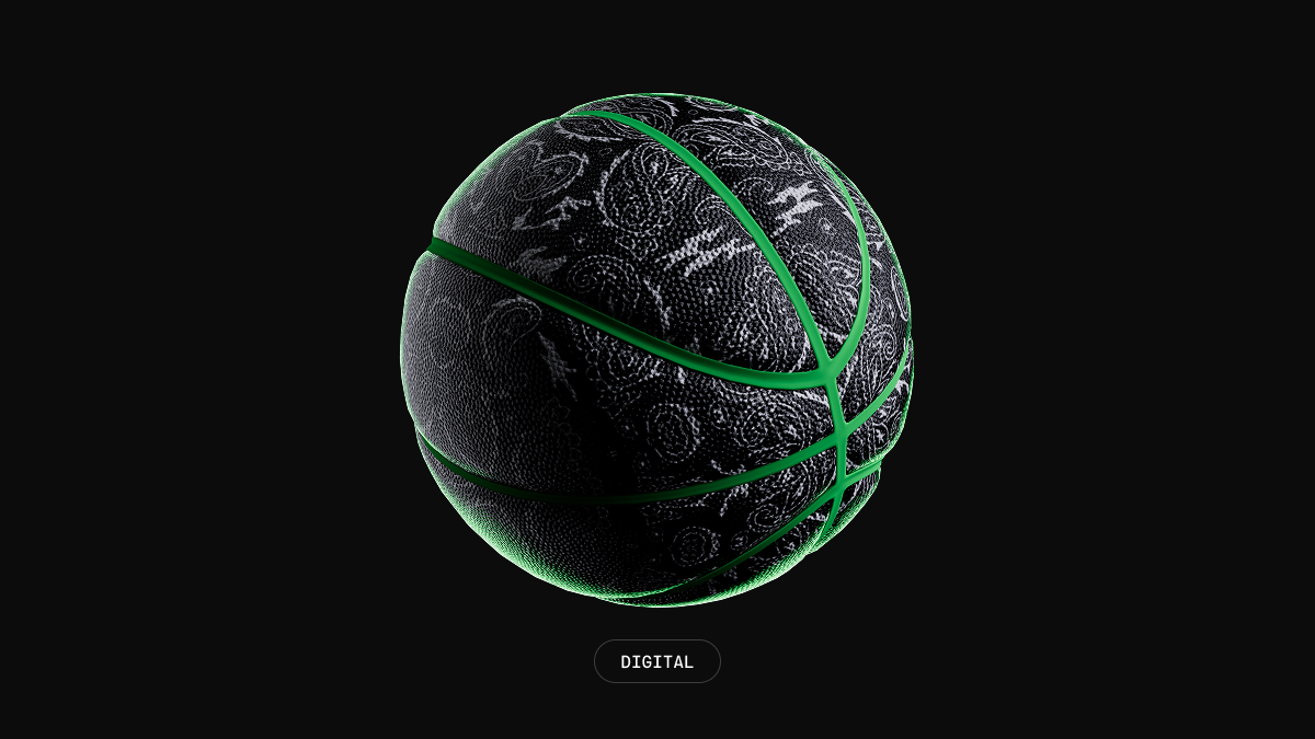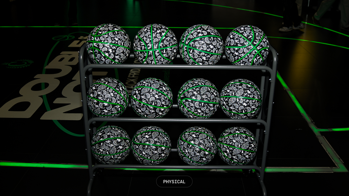 I wanted to integrate some basketball-focused elements as the hero graphic device, since it was a basketball challenge. So, I designed a simple black and green basketball that we could have customized for the event. It started as just a plain black ball with aloe green seams, but when we were in Las Vegas exploring with the team, we noticed that the Culture Kings basketballs have this gorgeous paisley pattern that, paired with the aloe green, looked really sharp. I quickly updated the 3D renders to include the pattern so the digital assets matched the real-life ball.