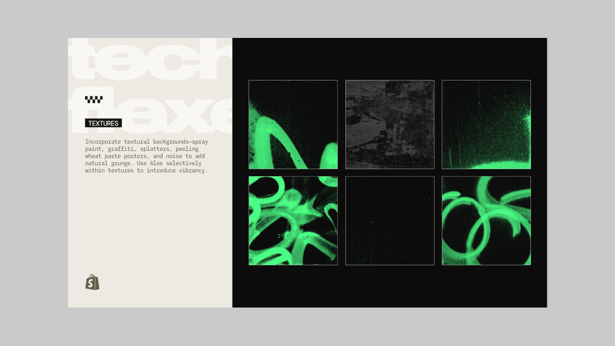 Pulling inspiration from the distressed and textural aspects of street art and screen-printed apparel, I started playing with spray paint and ink-bled typography. That all felt right, but it needed a colour that would stand out and really reflect this being a Shopify partnership. I chose a super vibrant Aloe green that, when applied to the spray paint, gave off a ‘glow in the dark’ effect that felt truly unique to this event.