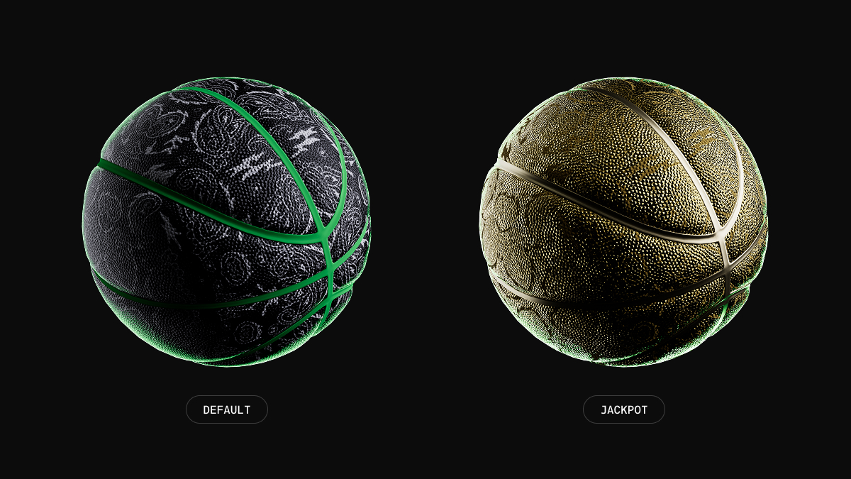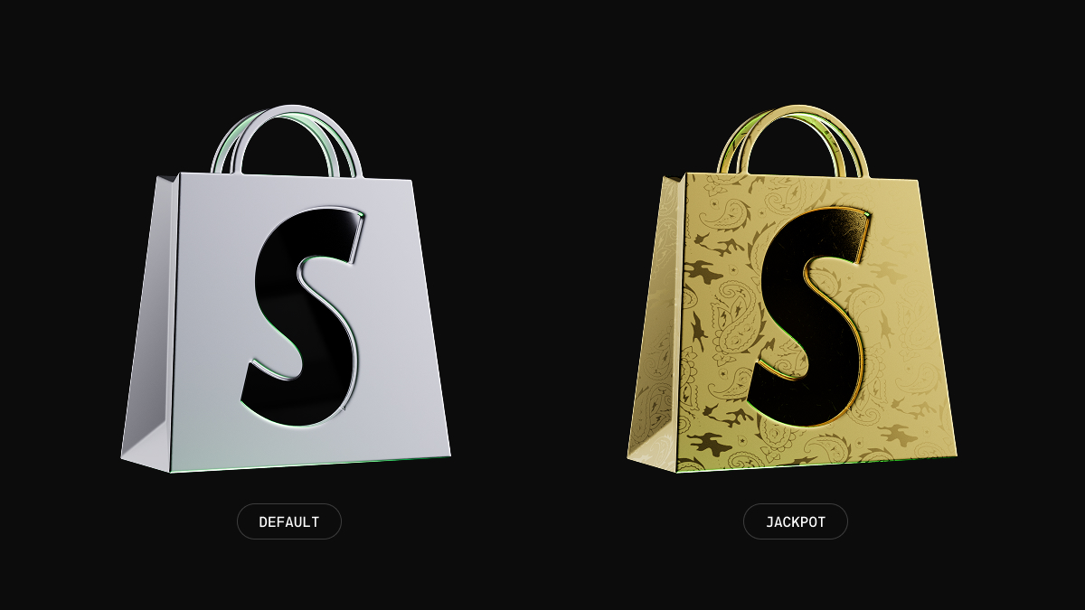 The motion design process turned into a snowball effect, pulling elements from one animation into another to further develop the idea. There were also small tweaks over time, like creating a more engaging Jackpot animation for when a customer scored the final shot. For that, I rendered a few animations using a gold-textured ball and Shopify logo. All together, it added a lot more hype to that final magical moment.